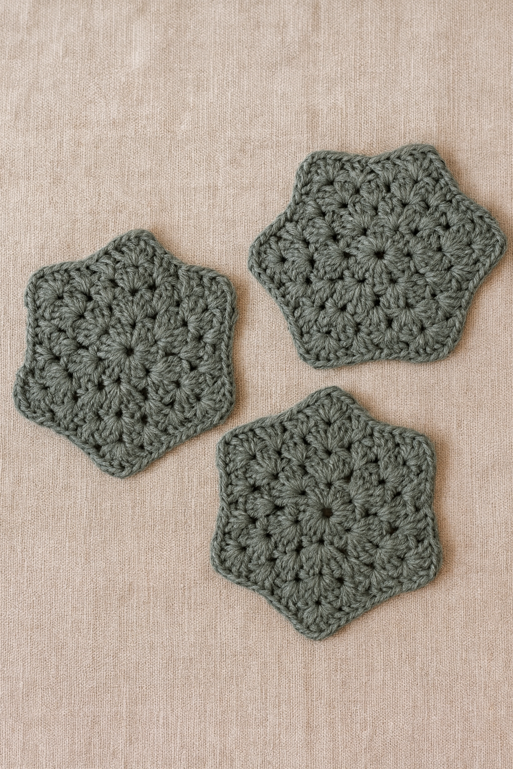 Hechos a mano en hilo de algodón de 6 hebras, son dobles para resistir tanto el calor de una taza de chocolate como la humedad de un vaso frío. Su textura firme protege la mesa sin perder suavidad al tacto.