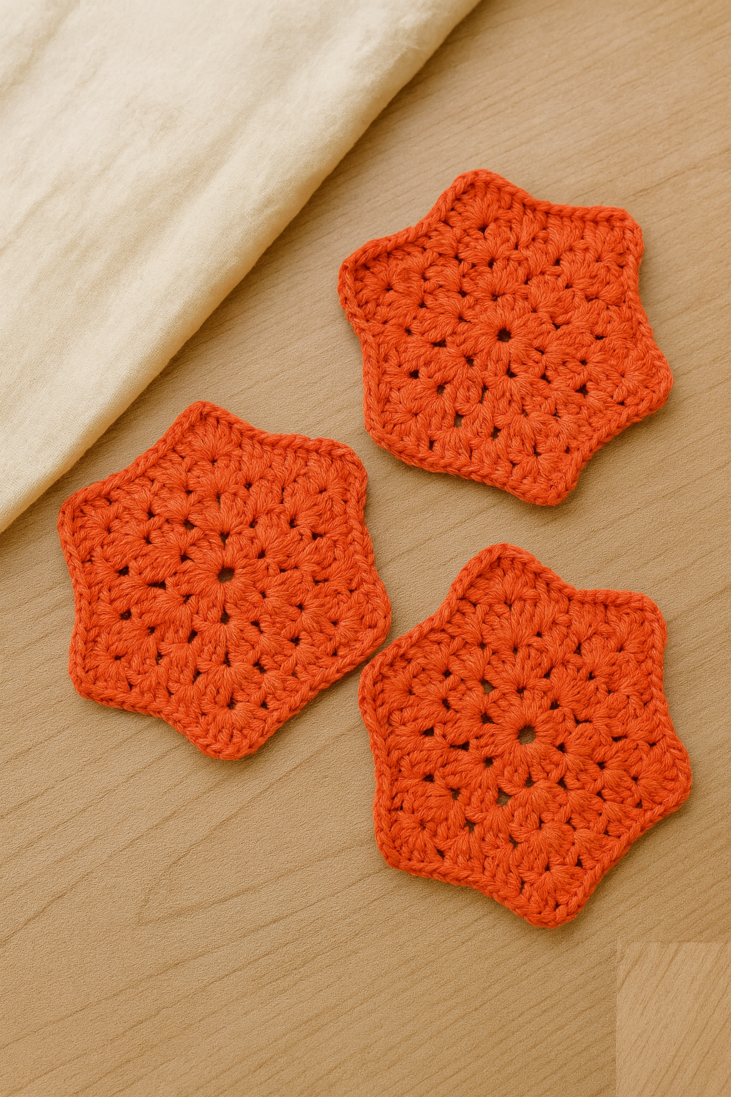 Hechos a mano en hilo de algodón de 6 hebras, son dobles para resistir tanto el calor de una taza de chocolate como la humedad de un vaso frío. Su textura firme protege la mesa sin perder suavidad al tacto.