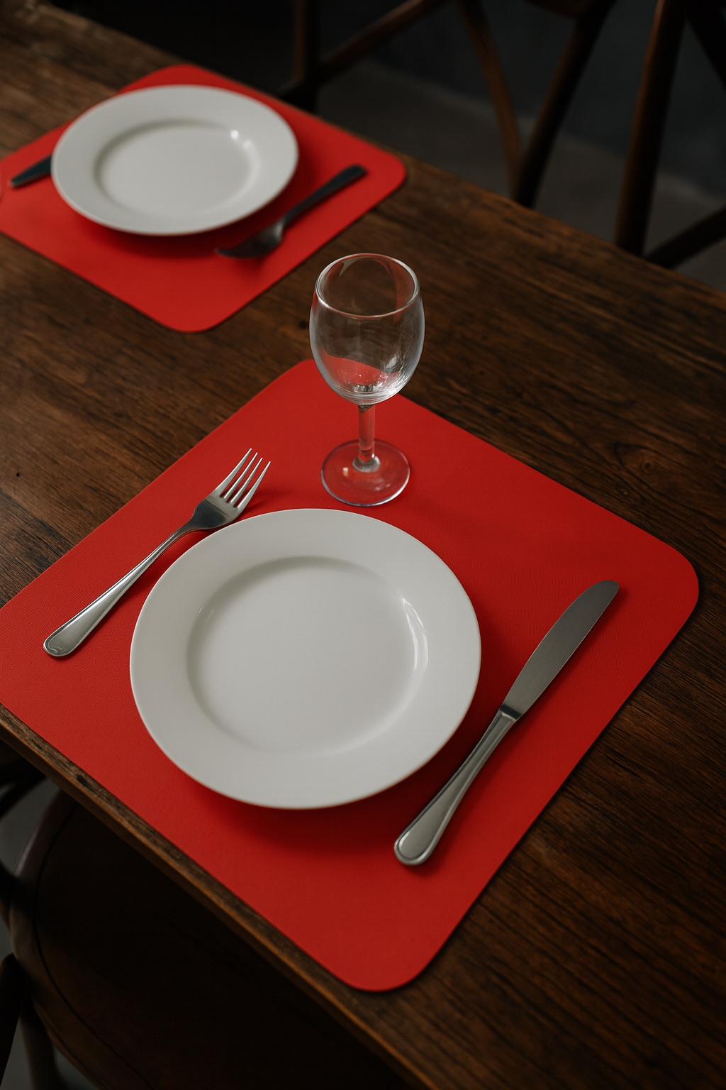 Confeccionados en tela engomada, en tono guinda, un rojo cálido y vibrante que realza la mesa con personalidad.